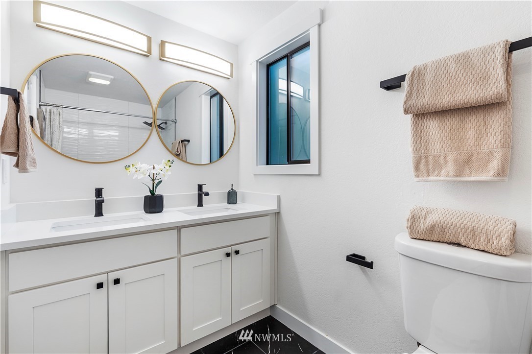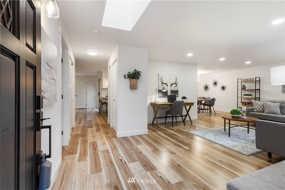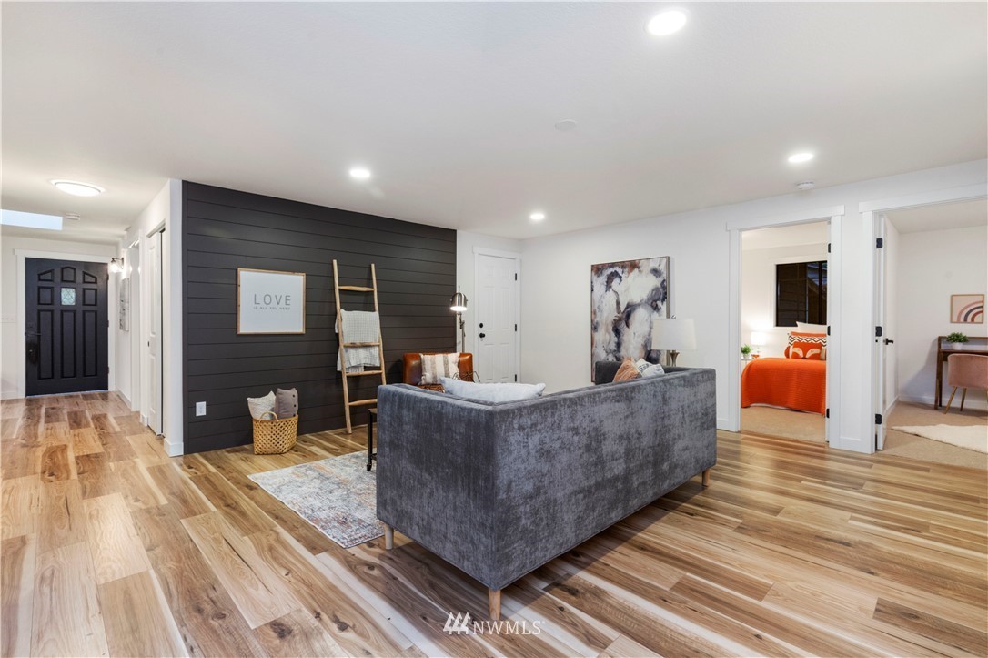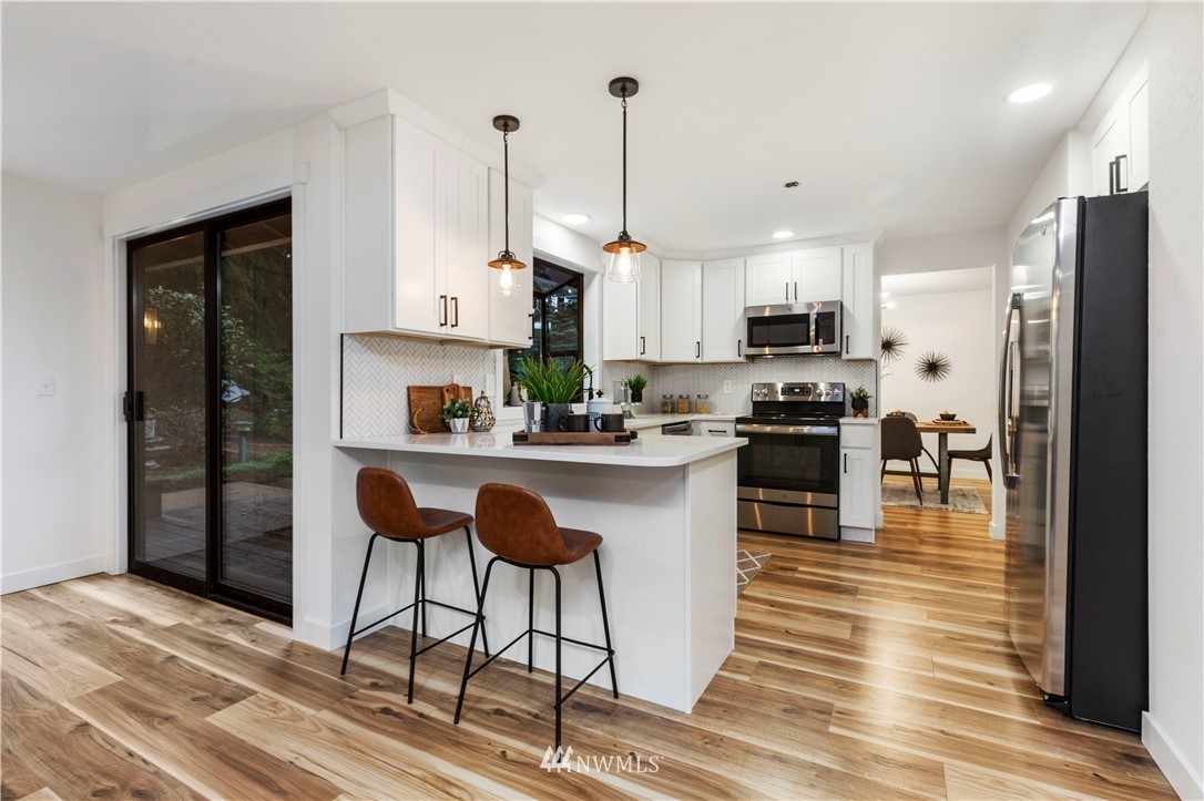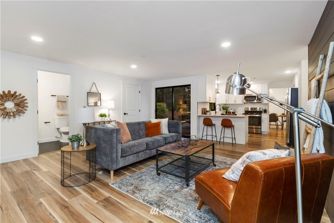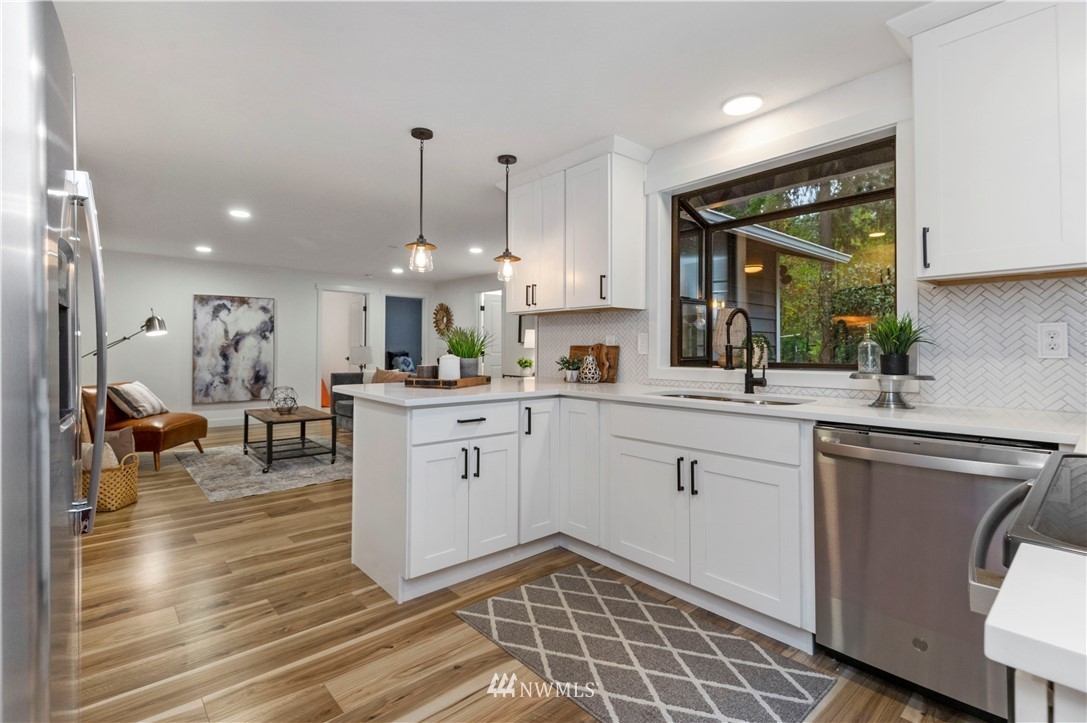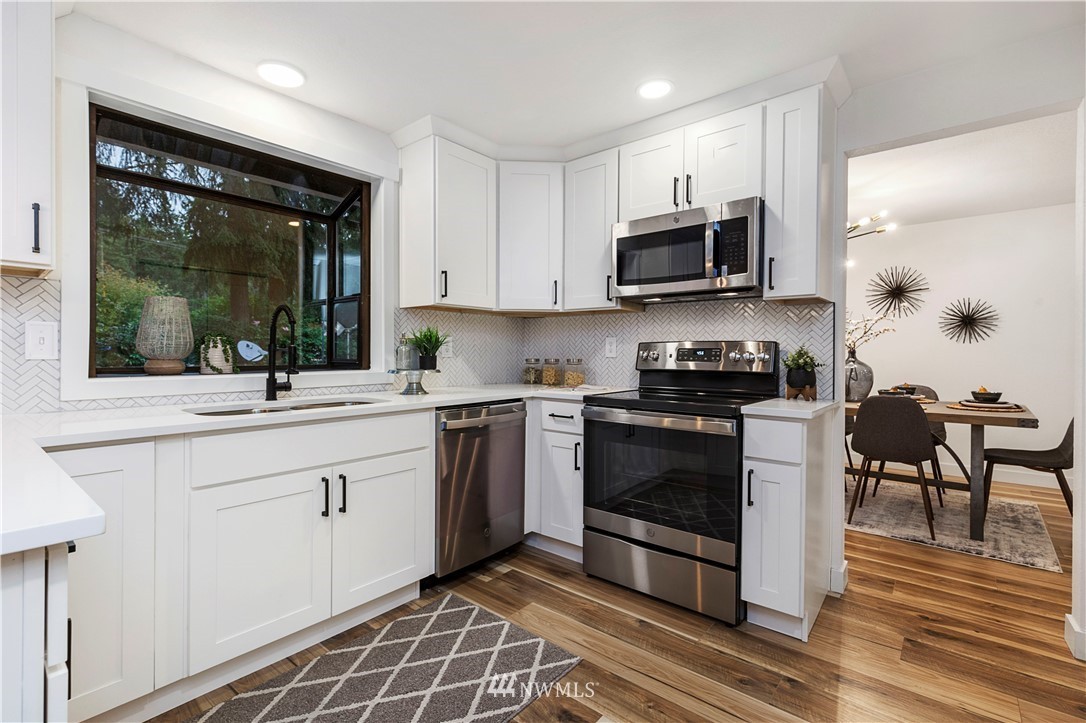 new roof, int/ext paint, laminate hardwood flooring, doors, trim, remodeled baths, open-concept kitchen, new stainless appliances, quartz counters, shaker cabinets, improve deck, new water heater, new landscaping