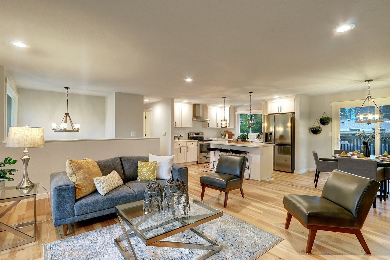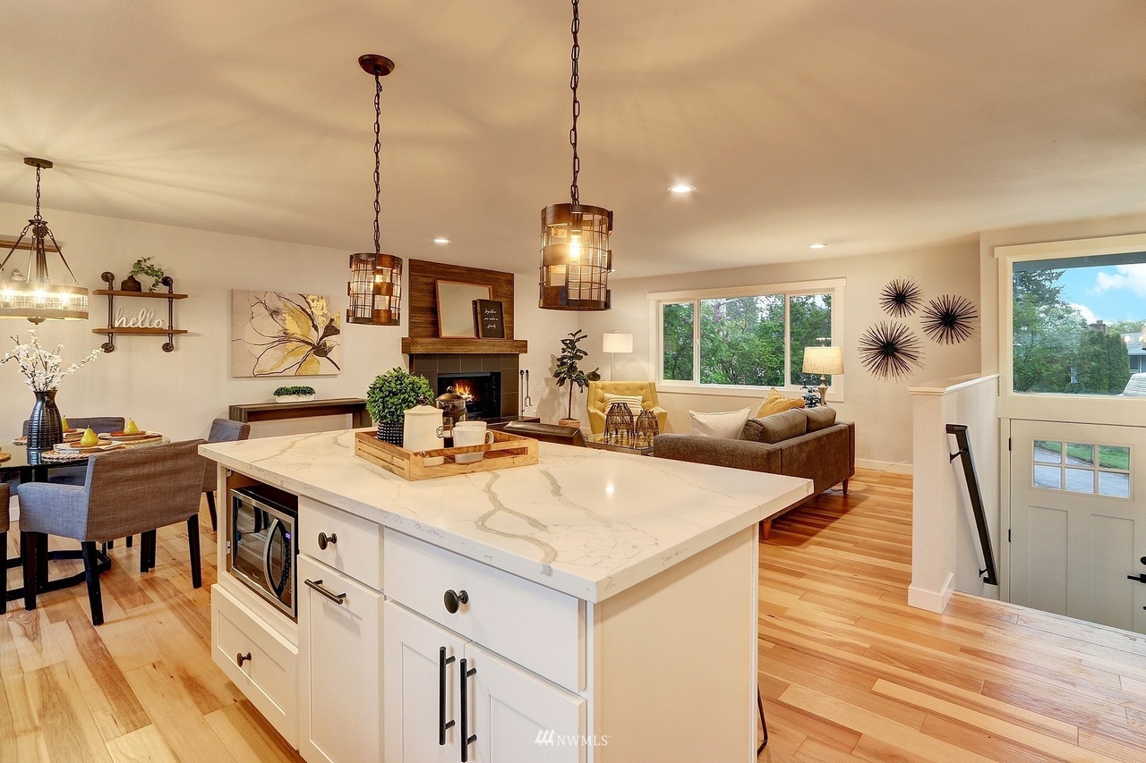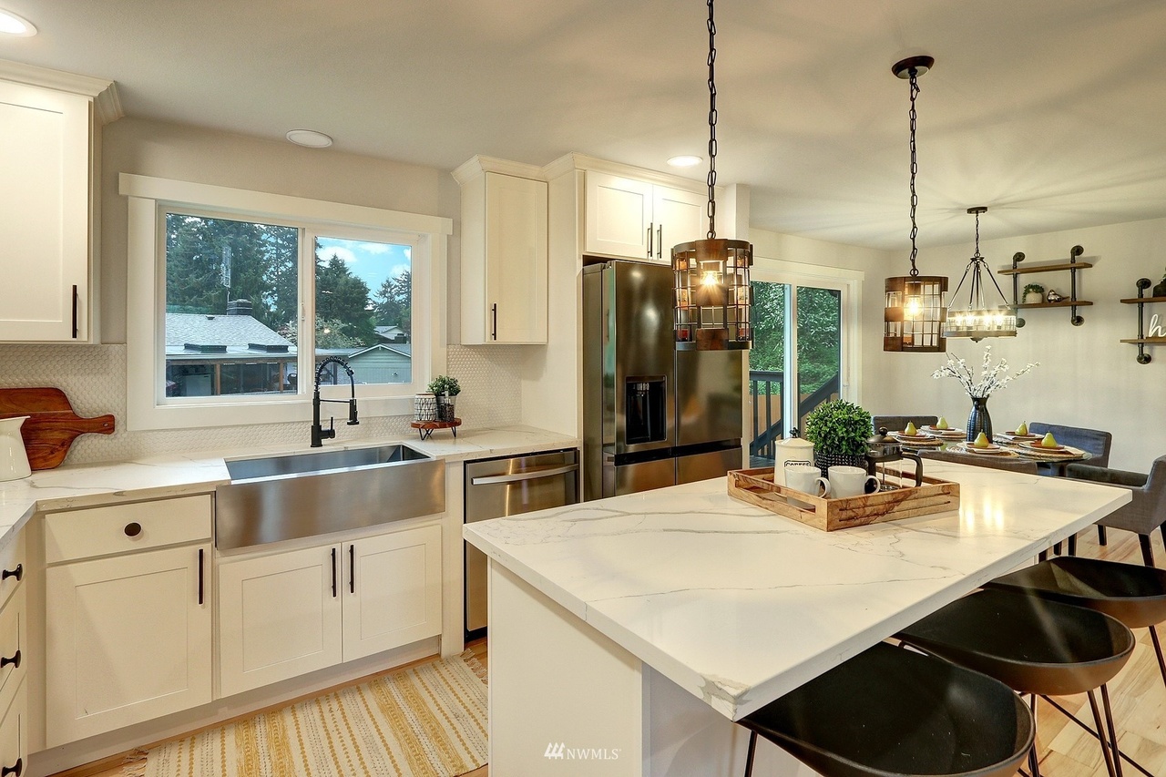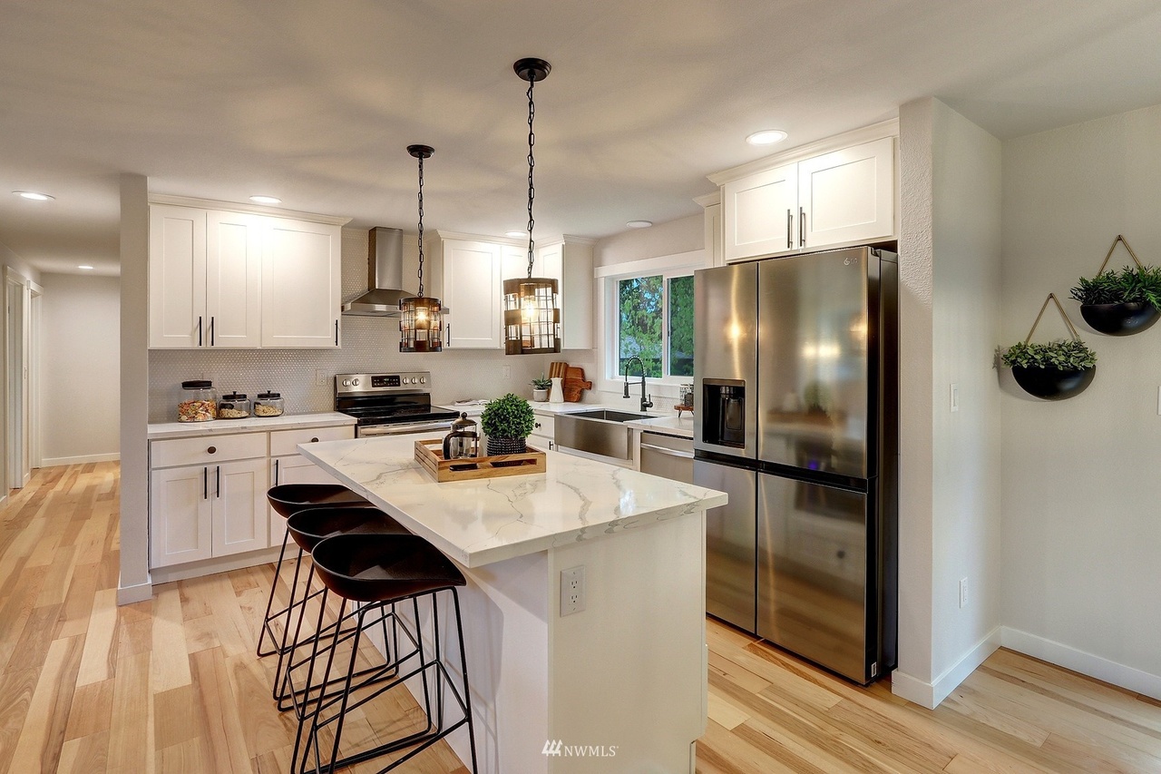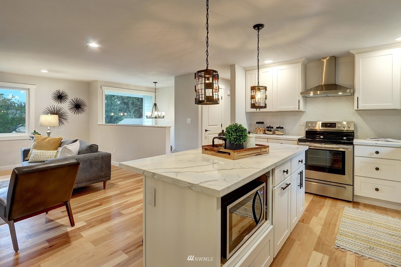 new roof, int/ext paint, laminate hardwood flooring, doors, trim, remodeled baths, open-concept kitchen, new stainless appliances, quartz counters, shaker cabinets, improve deck, new water heater, new landscaping